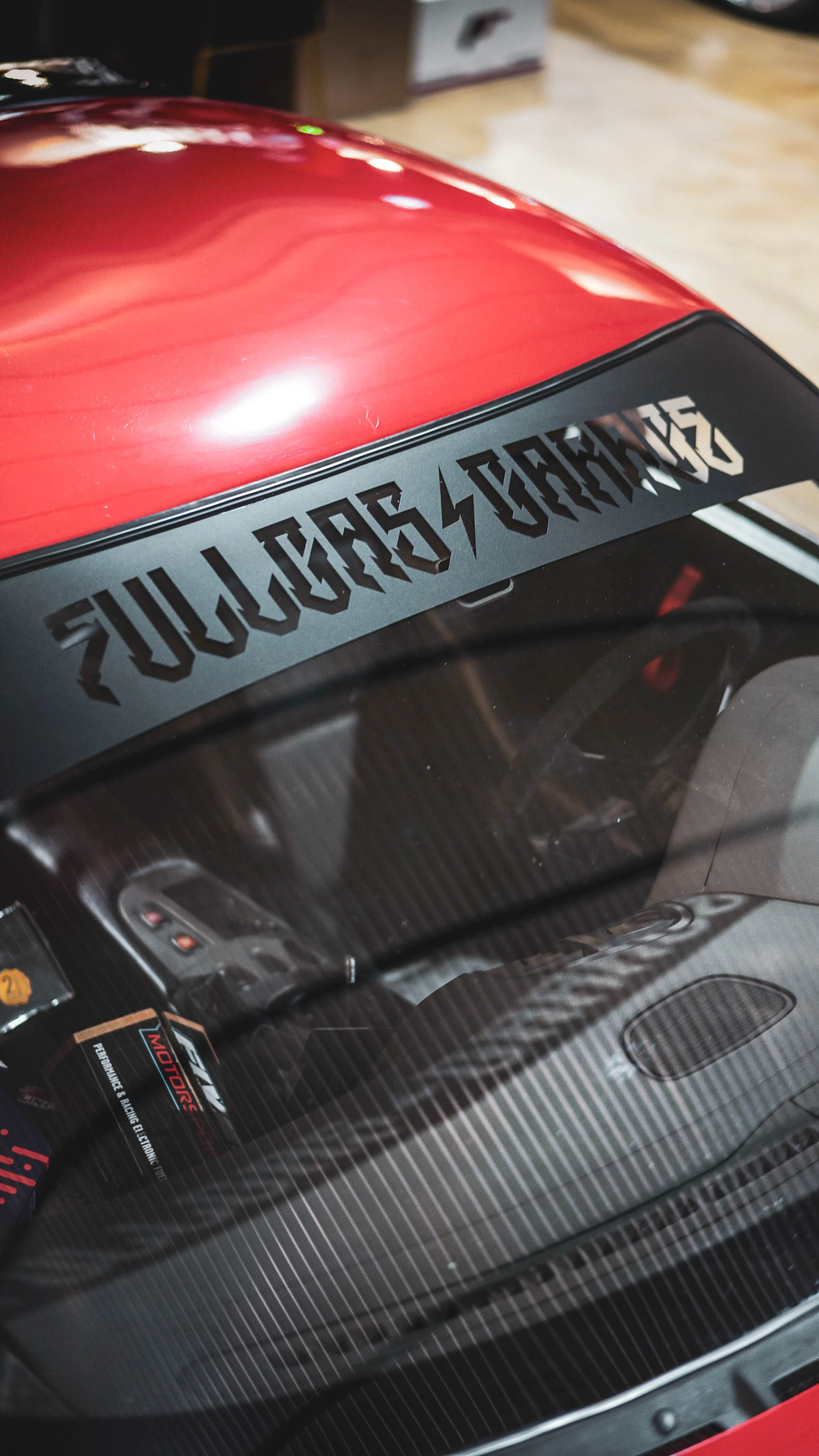 Visera en negro satinado con FULL GAS GARAGE troquelado.